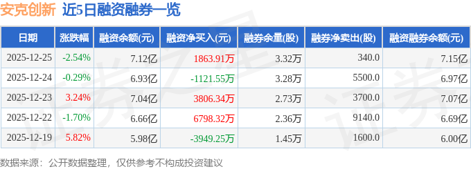 安克立异融资融券信息数据显现,融资方面,当日融资买入7394.19万元,融资归还5530.27万元,融资净买入1863.91万元。融券方面,融券卖出400.0股,融券归还60.0股,融券余量3.32万股,融券余额381.64万元。融资融券余额7.15亿元。